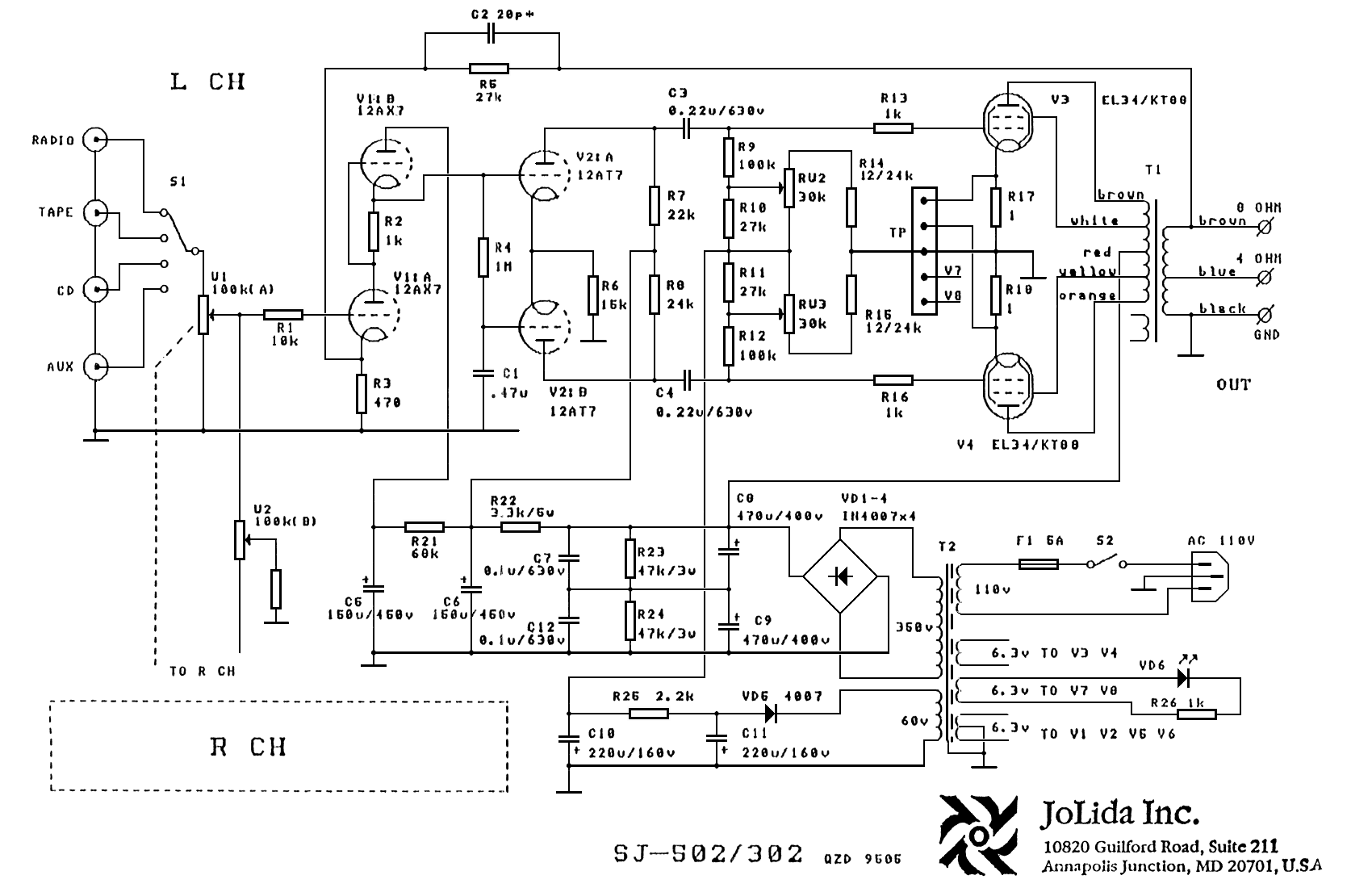 Jolida Schematics SJ-302A / SJ-502A amplifier Schematic, (JoLida) SJ-302B / SJ-502B amplifier Schematic, (JoLida)